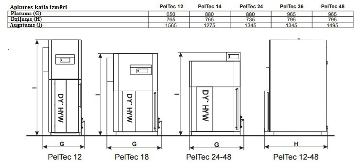 *Centrālās apkures granulu apkures katls PelTec ar iebūvētu degli un nominālu siltuma jaudu 12, 18, 24, 36, 48, 69 un 96 kW;