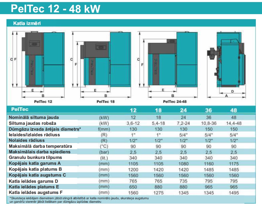 *Centrālās apkures granulu apkures katls PelTec ar iebūvētu degli un nominālu siltuma jaudu 12, 18, 24, 36, 48, 69 un 96 kW;