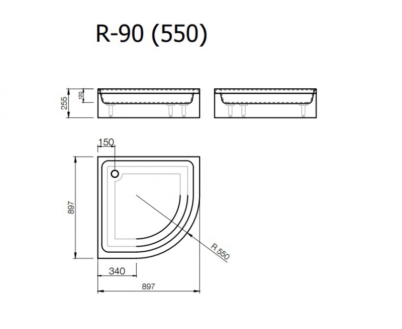 Akmens masas paliktnis R-90, 90x90x25cm pusaplis ar paneli, BEZ sifona