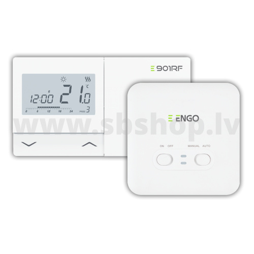 E901RF ir uz virsmas montējams, iknedēļas telpas regulators, ko izmanto apkures vai dzesēšanas ierīču un sistēmu bezvadu vadībai. Tas darbojas, uzturot komfortablus apstākļus telpā, saskaņā ar darba grafikiem vai lietotāja iestatītu nemainīgu temperatūru. Kontrolieris rūpnieciski ir savienots pārī ar uztvērēju. Uztvērējs ir pievienots, piemēram, apkures katlam.