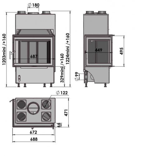 *Minimālie attālumi no uzliesmojošām sienām: sānos: 30 cm, aizmugurē: 25 cm, priekšpusē: 100 cm.