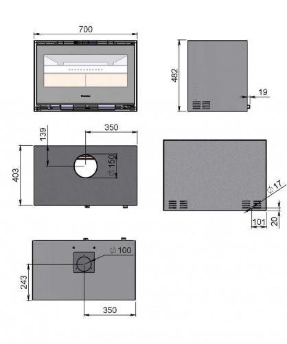 *Minimālie attālumi no uzliesmojošām sienām: sānos: 30 cm, aizmugurē: 25 cm, priekšpusē: 100 cm.