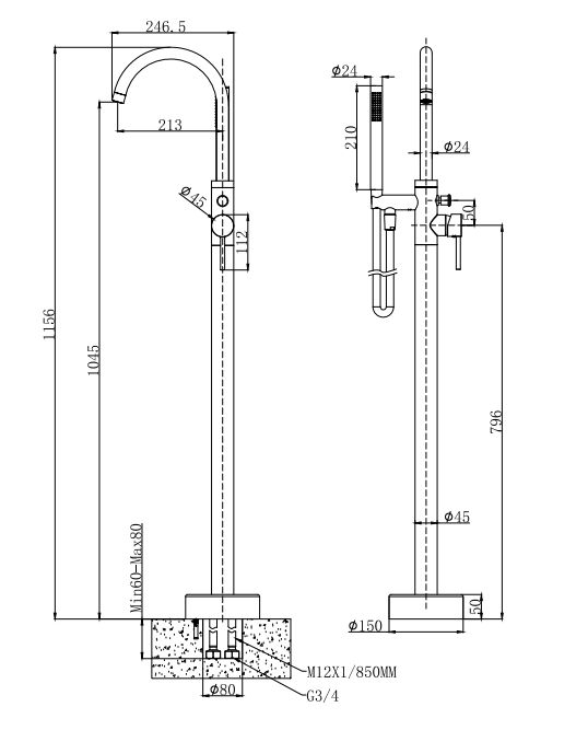 Vannas maisītājs no grīdas ALFRED ar rokas dušu GUN METAL krāsā