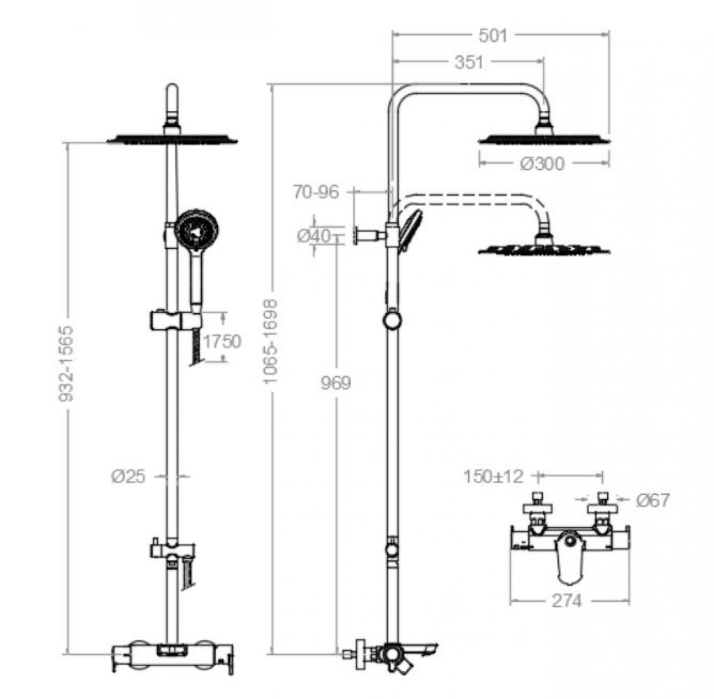 Vannas/dušas kolonna ar termostatu, lietus dušu D30cm un rolas dušu, teleskopiska, RamonSoler hroms