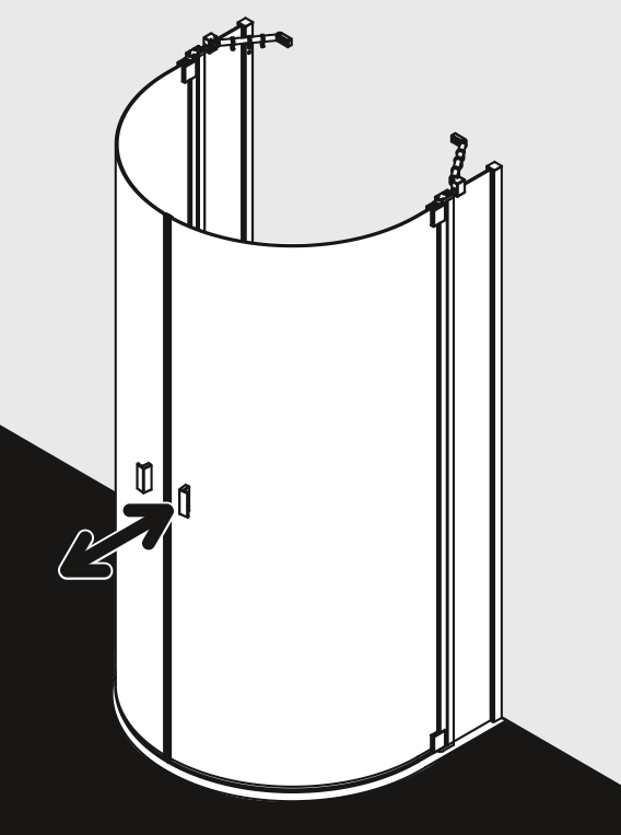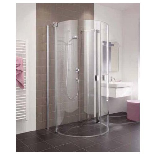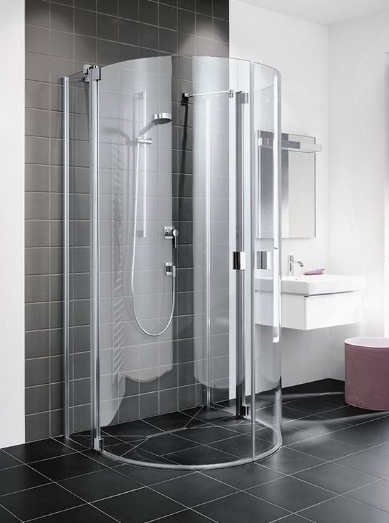 Pusapaļa dušas kabīne ar divām durvīm, veramām uz iekšpusi un ārpusi un diviem fiksētiem spoguļstikla paneļiem melni profili;