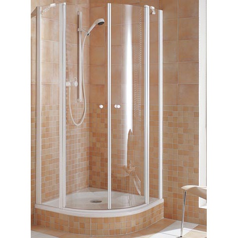 Četru daļu pusapaļa dušas kabīne ar divviru uz iekšpusi un ārpusi veramām durvīm;