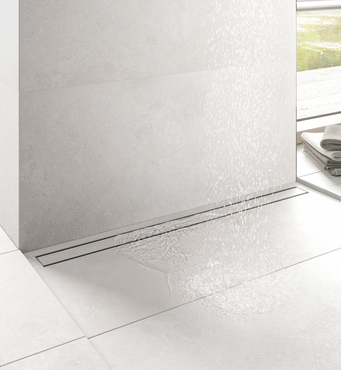 Dušas traps 90cm TECE ar flīzes (TILE) un STEEL dekoratīvo daļu, sifonu
