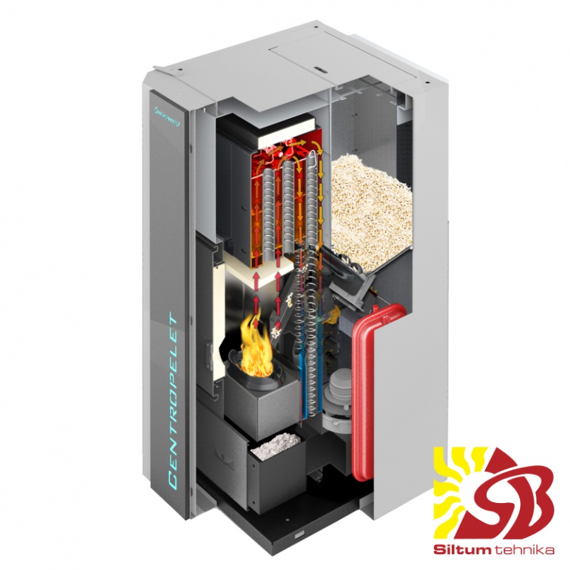Granulu kamīns CentroPelet ZVB ar integrētu centrālapkures sistēmu- sūkni, izplešanās trauku, drošības grupu, pilnu automātiku.