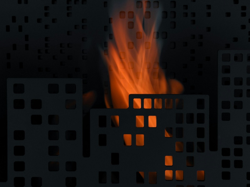Tehnoloģija un dizains apvienojas, radot skaistu un funkcionālu koncepciju. Naksnīgās pilsētas grafiskais siluets kombinējas ar dzīvu liesmu.