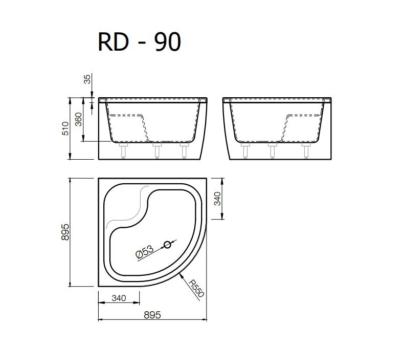 • Akmens masas paliktnis RD-90*90x51cm pusap.balts ar paneli BEZ sifona