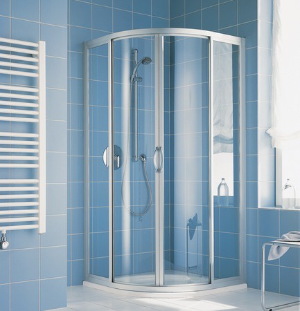 Četru daļu pusapaļa dušas kabīne ar bīdāmām durvīm;